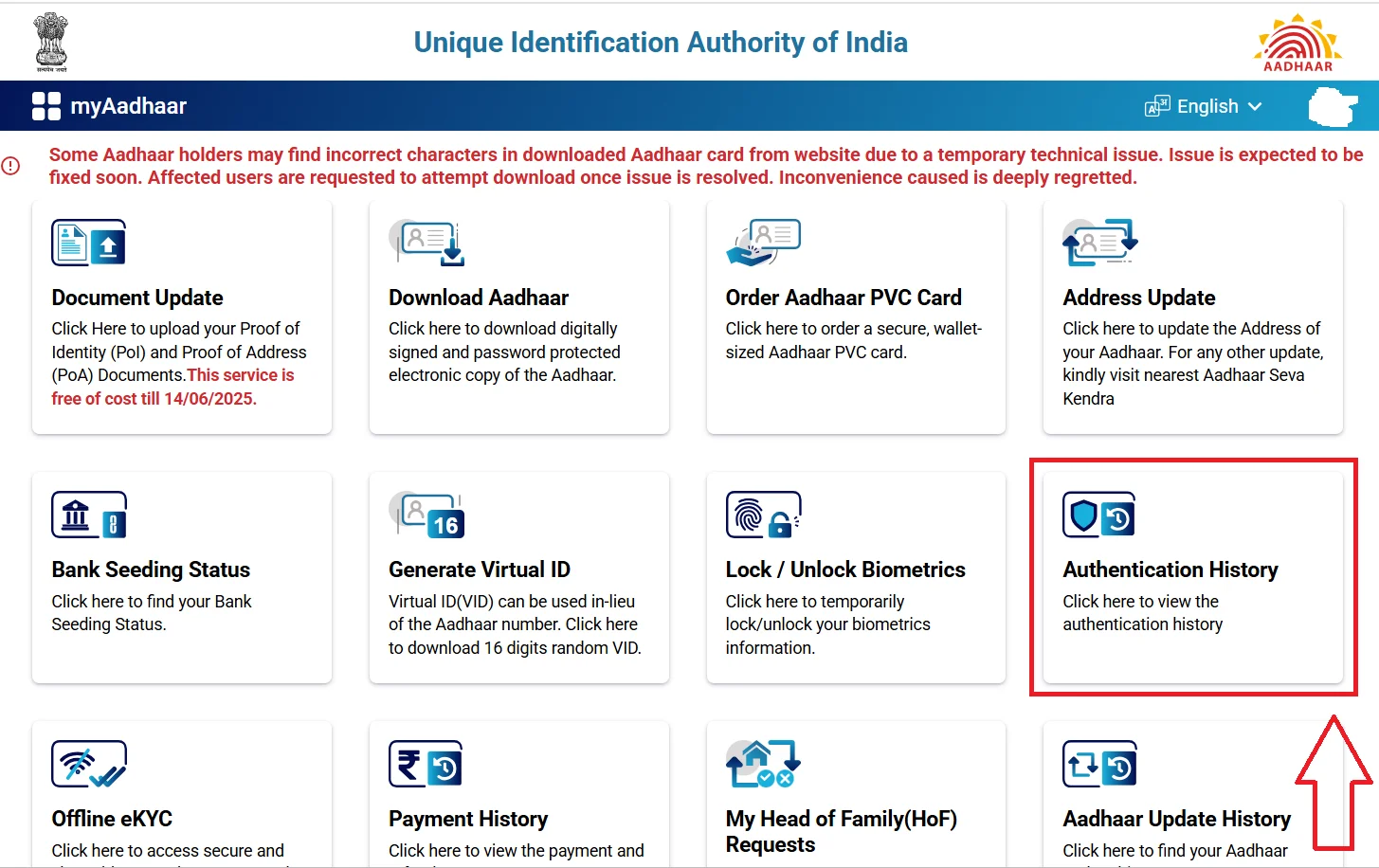 - સ્ટેપ 2:- ત્યારબાદ “My Aadhar” ઓપ્શન પર જાઓ અને “આધાર ઓર્થેન્ટિક હિસ્ટ્રી” પર ક્લિક કરો.